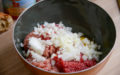 • Prendre un récipient et y mettre la chair à saucisse et le bœuf haché ; si vous n’avez trouvé que des saucisses, comme moi, incisez le boyau pour ne garder que la chair.