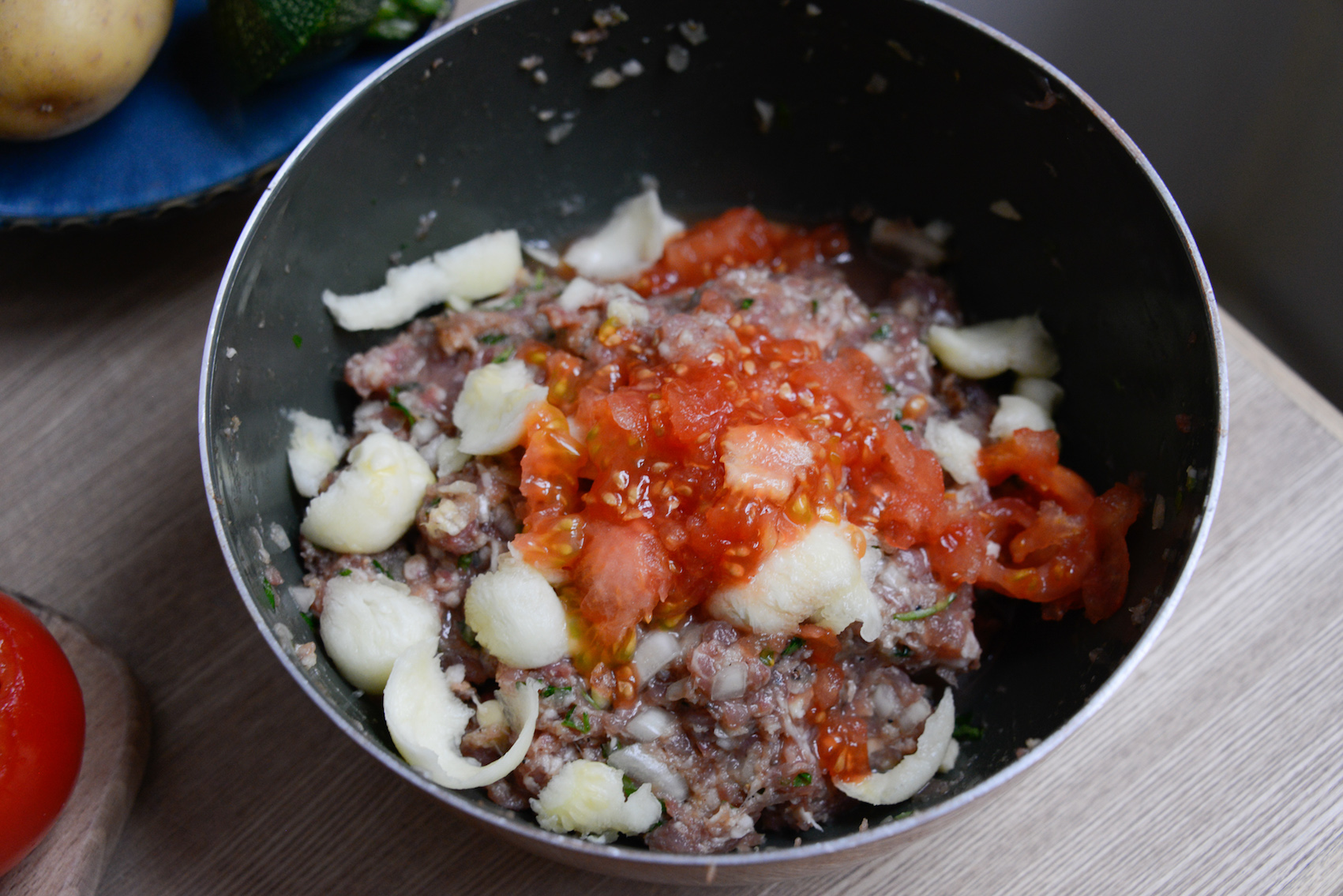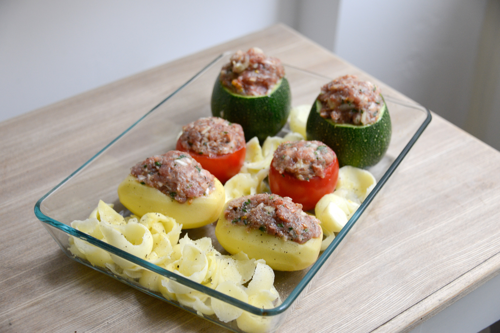 Il vous faut : 2 courgettes, 2 pommes de terre à farcir, 2 tomates, 350 gr de chair à saucisse, 1 steak haché, 2 tranches de pain rassis, 1 œuf, 1 oignon, 1 gousse d’ail, un peu de lait, du sel, du poivre, du piment d’Espelette et du persil. – 40 à 50 minutes.