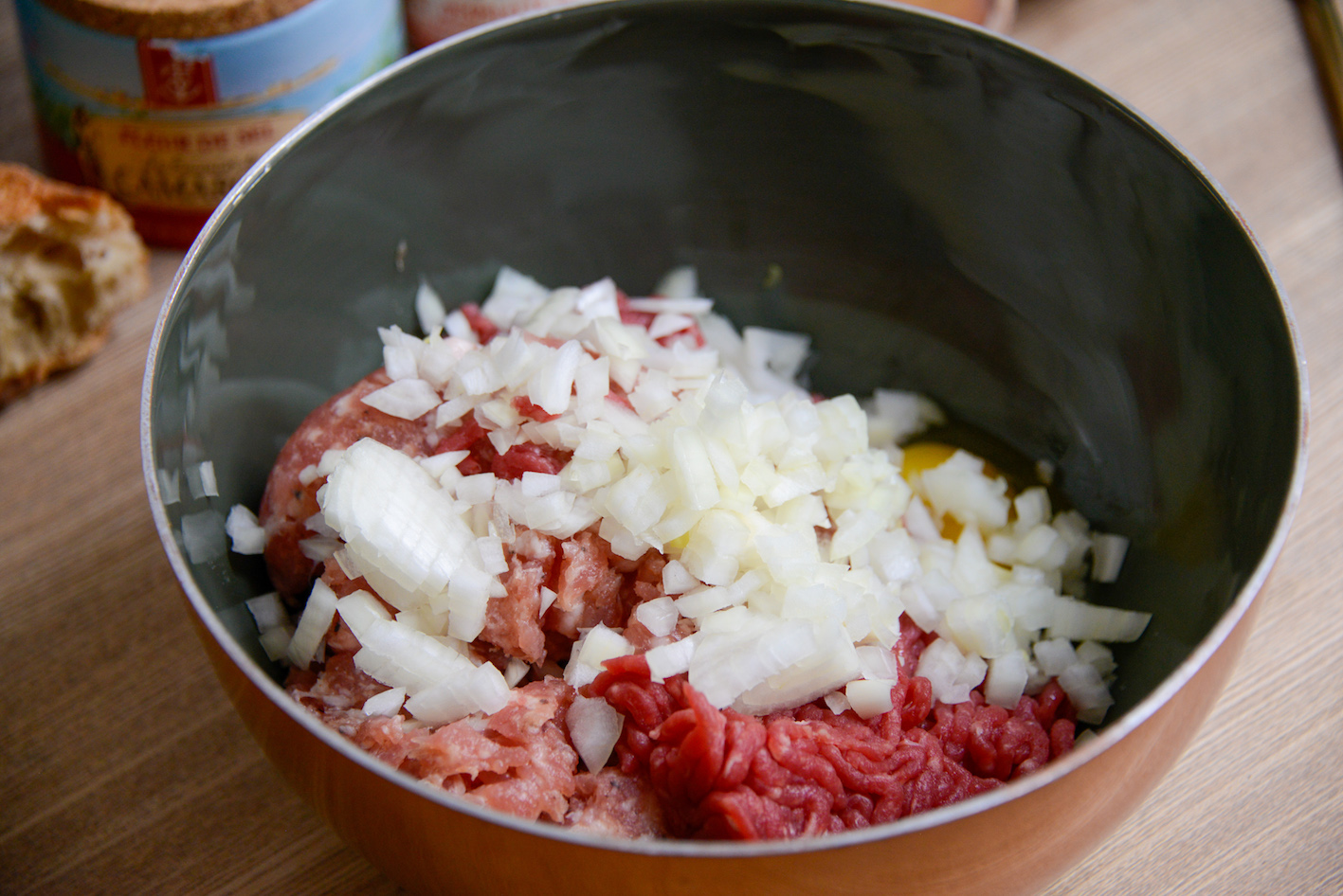 • Prendre un récipient et y mettre la chair à saucisse et le bœuf haché ; si vous n’avez trouvé que des saucisses, comme moi, incisez le boyau pour ne garder que la chair.