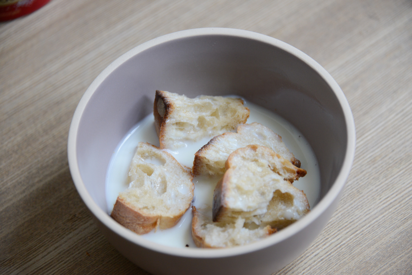 • Prendre un petit bol et mettre les deux tranches de pain rassis, ajouter du lait à hauteur puis laisser le pain s’imbiber.