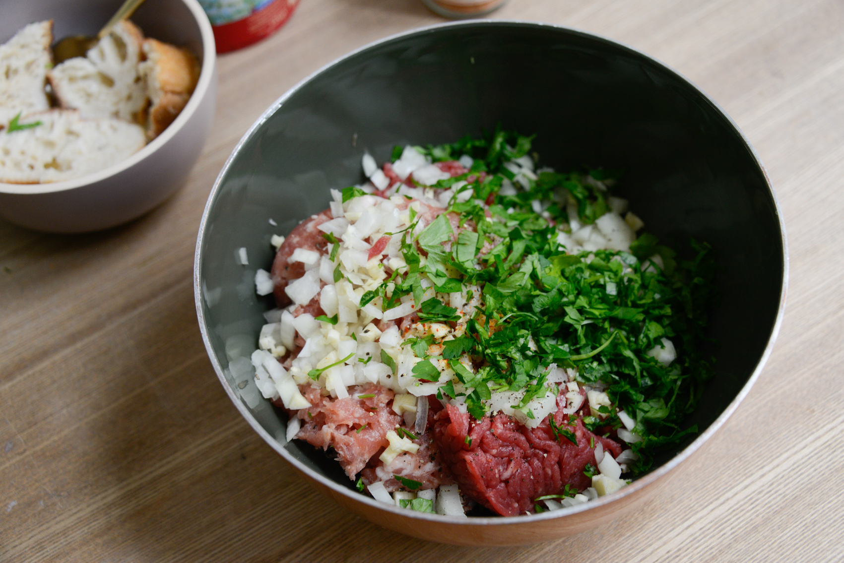 • Ciseler l’oignon, l’ail et le persil ; les rajouter dans le bol avec la viande.